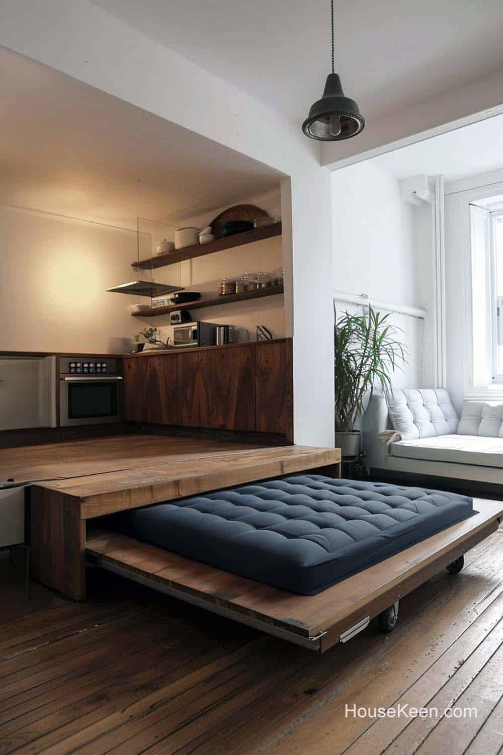 This time the space has been used as kitchen space. The rendering shows how you can put wheels under the bed frame and have it hide under a section of the room that’s slightly raised.