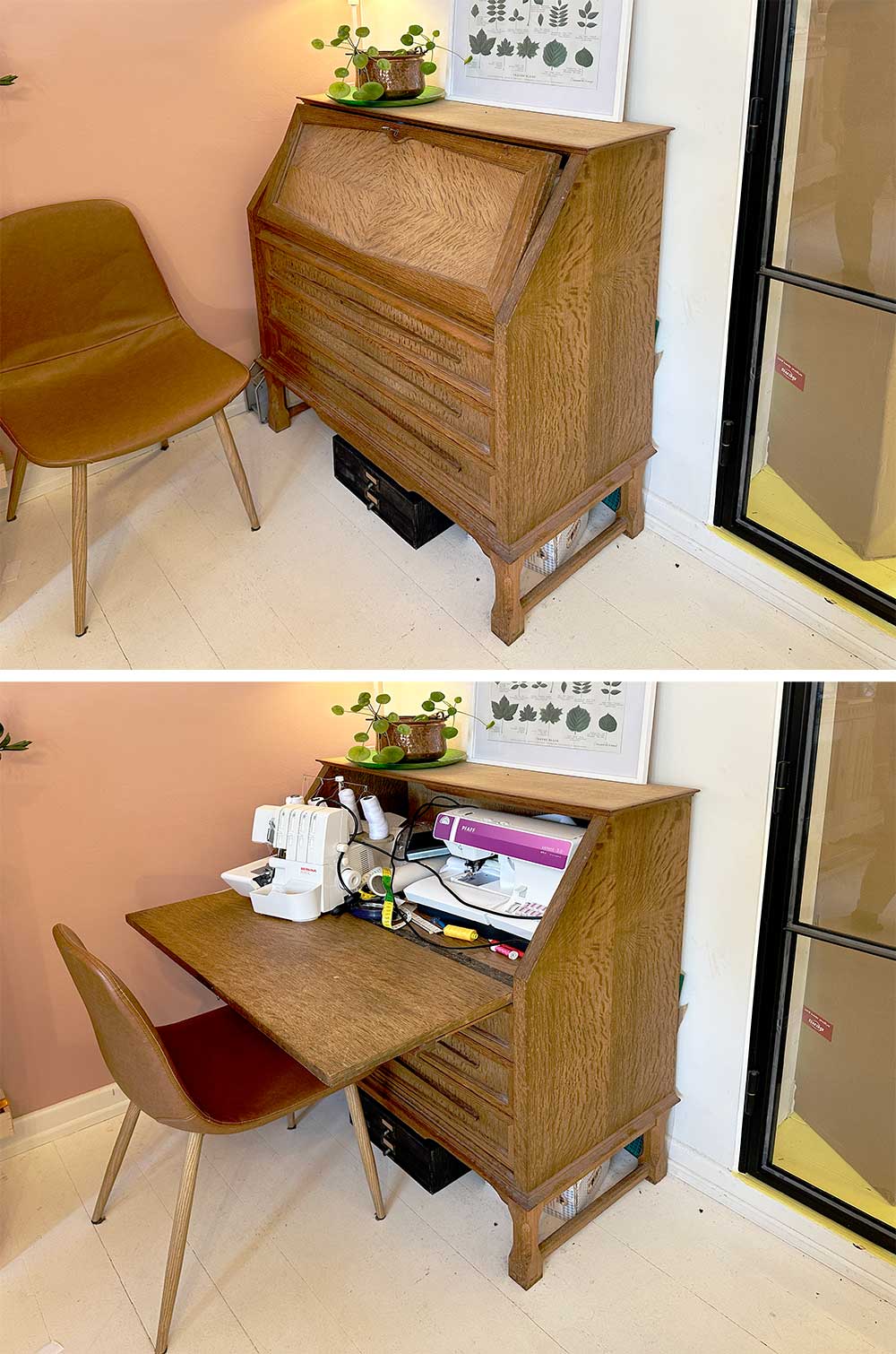 This old roll-top-style design can be a great way to hide your sewing gear in the main living room, if you don’t have a separate room for sewing. That’s what we’ve done!