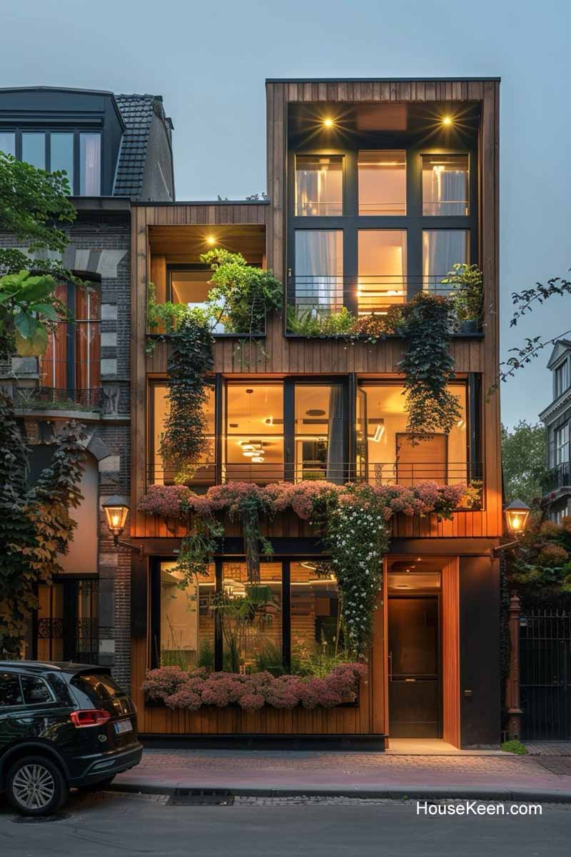 This home is a more modern take on a brick-based home with wooden panels on the outside.